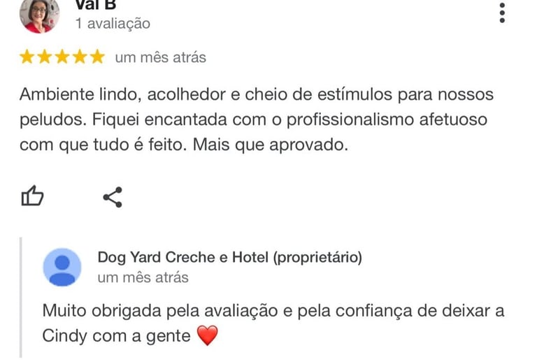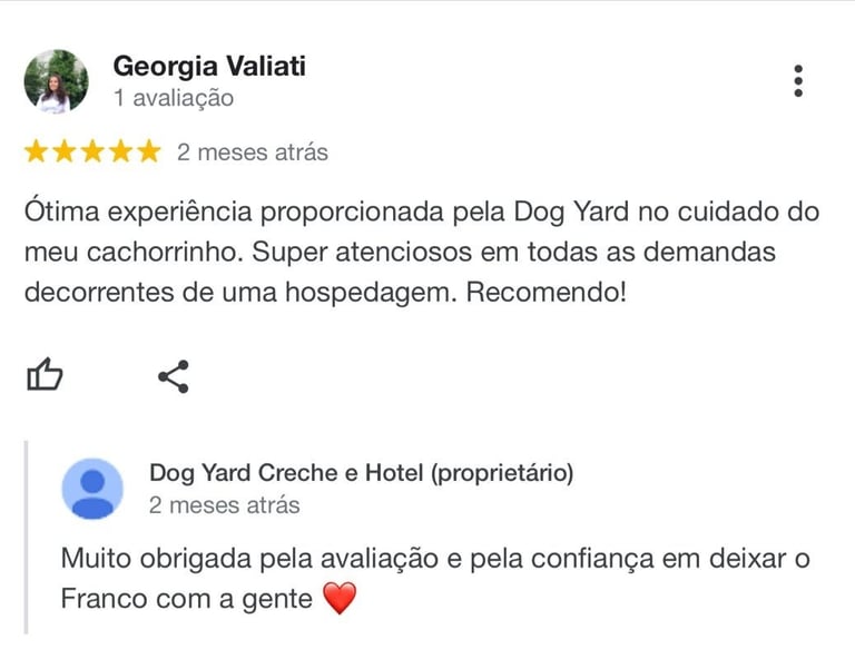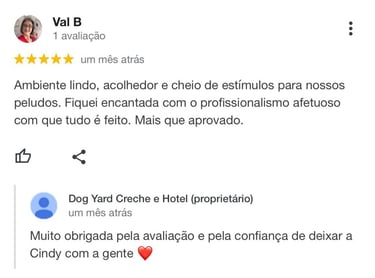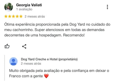 Na Dog Yard, seu pet é tratado com respeito e amor. Oferecemos hospedagem livre de gaiolas para que seu melhor amigo se sinta em casa.